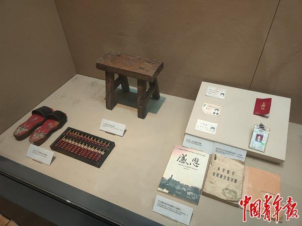 展厅参观的必经之路上,有一条窄窄的通道。穿过通道,走到尽头的展柜前,低头就能看到这双红底木屐鞋。透过玻璃,可以看见它磨损的鞋面,和内底上斑驳的仙鹤、水草。它的旁边放了一把归零的算盘。说明牌上介绍,它们是“打工妹、打工仔用过的生活用品”。